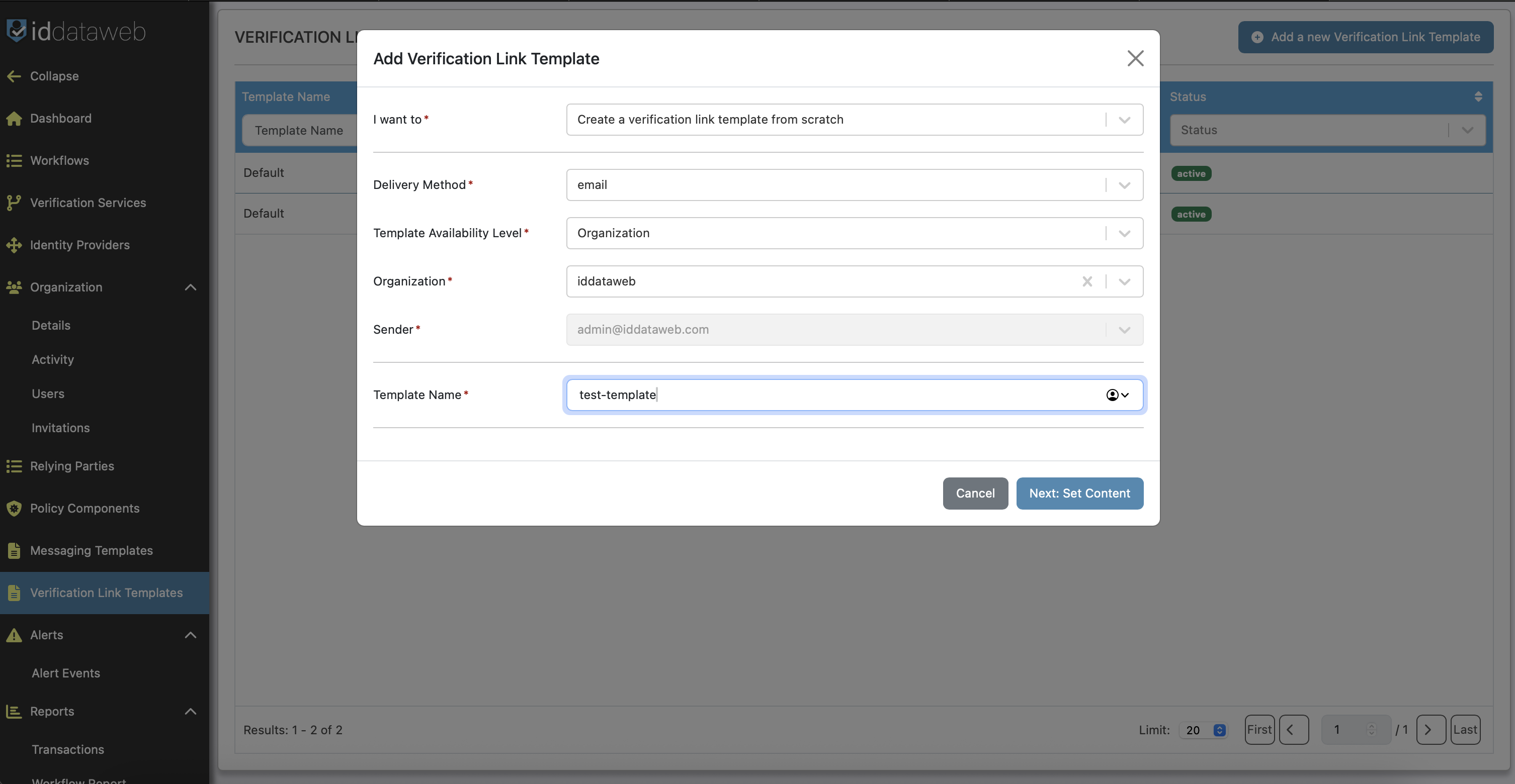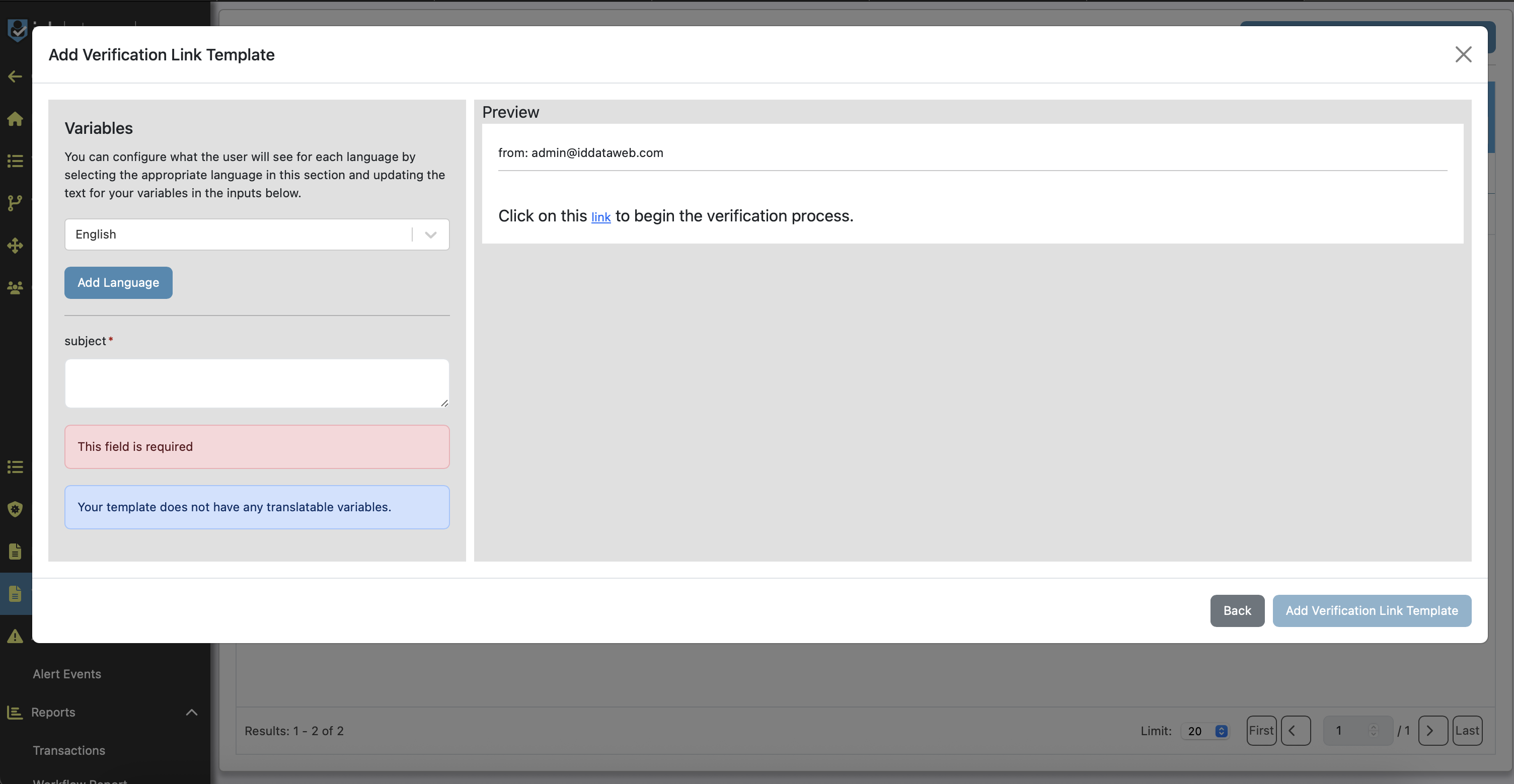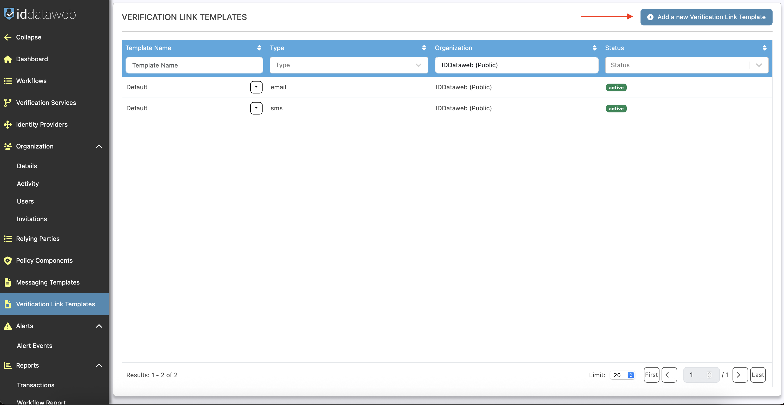- On the Verification Link Templates page, select the "Add a New Verification Link Template" button in the top right of the page